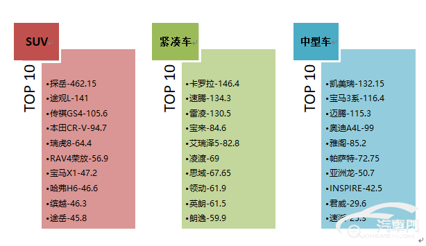 从SUV、紧凑车和中型车三大细分市场投诉指数TOP10榜单来看,各细分市场主力热销车型投诉位居前列。SUV榜单中,南北大众热销车型探岳和途观L继续强势上榜,此外上榜的三款车型为传祺GS4、瑞虎8和缤越三款自主品牌;紧凑车榜单中,卡罗拉位居首位,仅自主奇瑞艾瑞泽5上榜;中型车榜单中,凯美瑞位居第一,紧跟其后的是宝马3系,发动机烧机油问题集中爆发。
