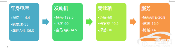 七、从质量投诉指数来看,伴随着车载网联和高科技配置搭载,加上供应商配件质量参差不齐,车身及电气相关层面质量投诉继续以28%的份额位居首位,代表车型为探岳和凯美瑞;其次是核心部件发动机和变速箱,分别占比24%和19%,发动机投诉代表车型分别是探岳和飞度,变速箱投诉代表车型迈腾和卡罗拉;值得注意的是,探岳和探岳GTE车型分别在车身电气、发动机、变速箱和服务等四大层面均有出现,对产品口碑影响巨大。