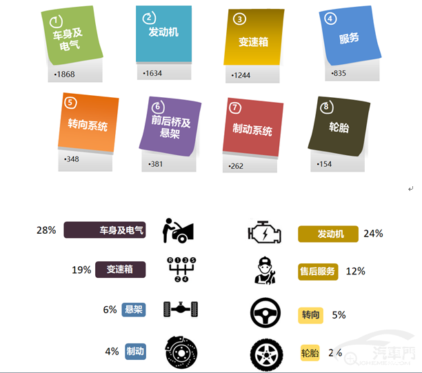 汽车门网将车辆质量投诉分为发动机、变速箱、制动系统、悬架系统、转向系统、轮胎、车身及电气和服务八大类。通过对本月车型投诉指数分析,投诉问题主要集中在车身及电气、发动机、变速箱和售后服务四个层面,其中车身及电气层面占据绝对的投诉份额,占比为28%。