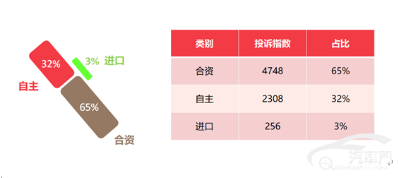 三、从车企类别投诉指数来看,合资车型受市场保有量大,投诉问题集中影响,投诉指数继续占据65%的高份额,位列前三的车企分别是一汽-大众、上汽大众和一汽丰田;自主品牌投诉量占比32%,投诉前三名车企分别为奇瑞汽车、吉利汽车和长城汽车。