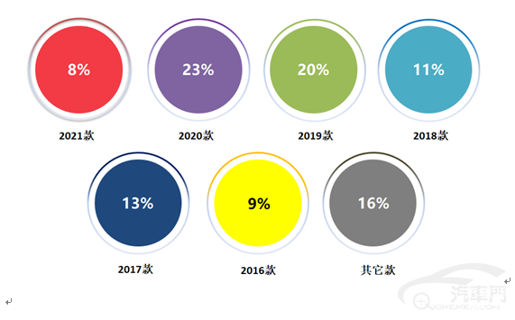 六、从车款投诉指数来看,2020款车型均以23%的份额继续占据第一的位置,探岳位列款型投诉首位;2019款车型均以20%的份额继续占据第二,探岳同样位列车款首位;2021款一年内新车占比8%,代表车型分别是雷凌、Model Y等。