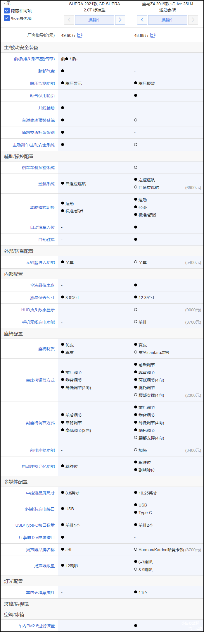 SUPRA为什么比Z4起步价格高,小猫认为这主要是因为配置水平更高。对比 SUPRA与Z4的入门车型,前者多出前排头部气囊、膝部气囊、胎压显示、并线辅助、车道偏离预警系统、道路交通标识识别、主动刹车、自适应巡航、无钥匙进入等实用性、安全性配置,Z4则只是多出车内环境氛围灯、车内PM2.5过滤装置、全液晶仪表盘、自动泊车、自动驻车等;就配置实用性而言,SUPRA要更胜一筹。