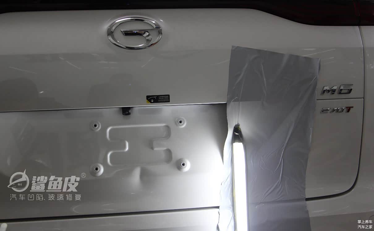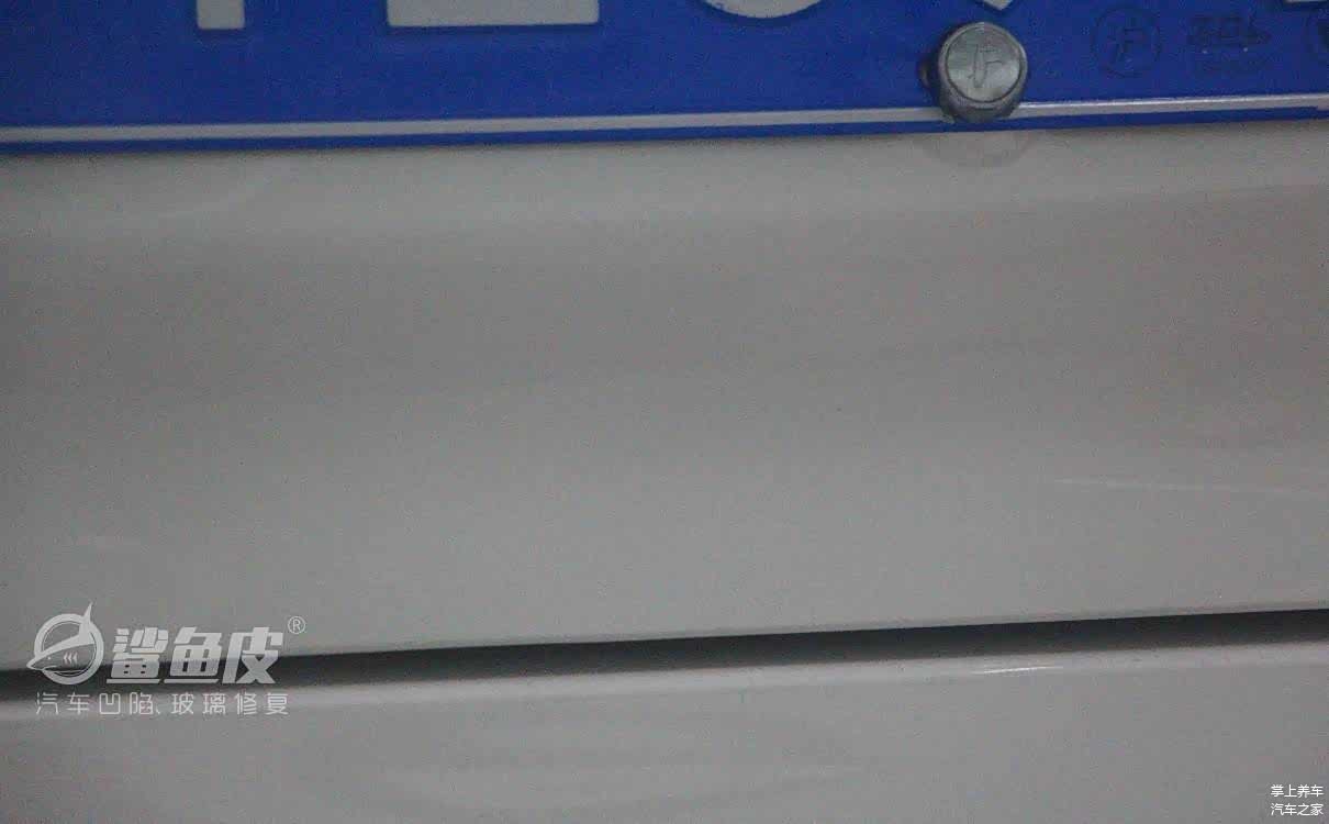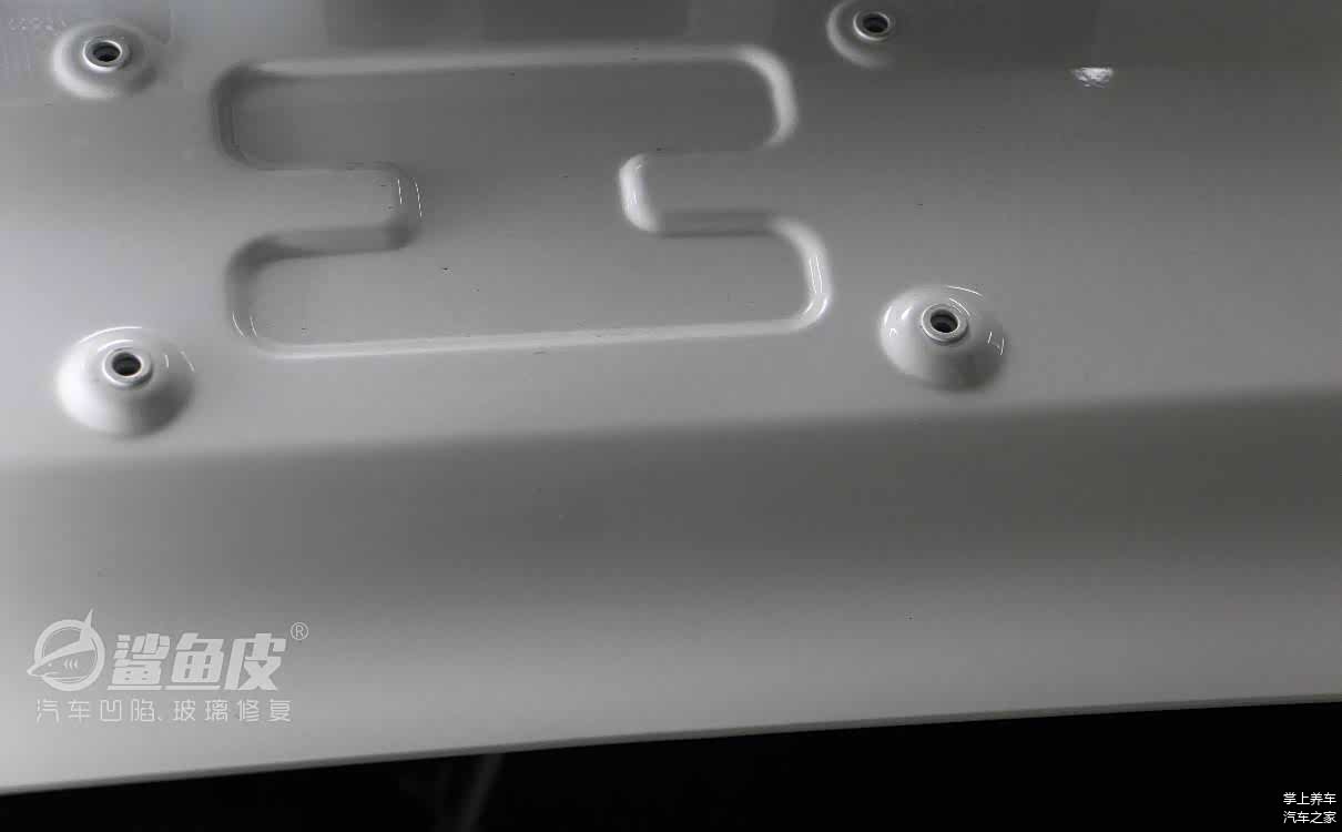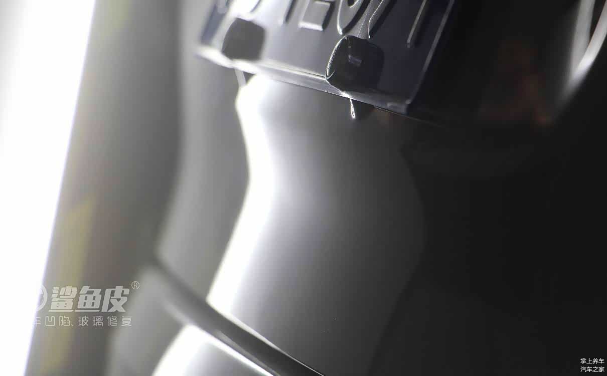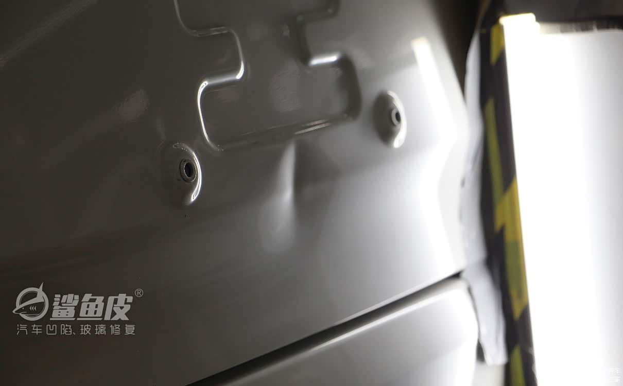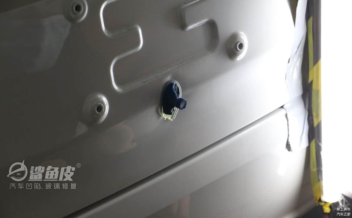 这个后盖撞的还是比较深的,估计再深一点就要裂漆了,为了保险起见还是叫师傅看了一下,师傅表示没问题,这个凹陷在后盖偏中间的位置修起来比较方便。首先可以从外面拽出来一部分,因为这个是在一条筋线上面,从外面拉不要想着彻底拉好,只是让这个坑更浅一点。不然直接顶容易裂漆。