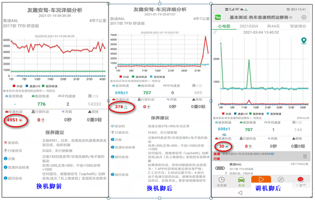 奥迪A6L(图片 | 参数 | 询价) ,4年7万公里,怠速抖动非常严重,APP测试高达5000,建议换机脚。按说这个车龄,不至于这么严重。但是奥迪机脚特别容易损坏漏油,会引起剧烈的怠速抖动。在4S检查后,确认机脚已坏,更换了两个机脚。换完机脚,抖动瞬间降低了,降到了370多。