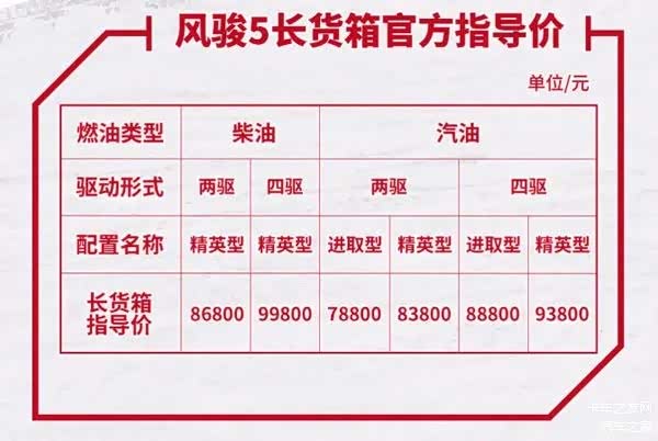 近日,《卡车之友网》记者从长城汽车获悉,长城皮卡旗下 风骏5(图片 | 参数 | 询价)长货箱版正式上市;新车分柴油/汽油、两驱/四驱、精英/进取在内共计6款车型,其中柴油两驱精英型售价8.68万元,柴油四驱精英型售价9.98万元,汽油两驱进取型售价7.88万元,汽油两驱精英型售价8.38万元,汽油四驱进取型售价8.88万元,汽油四驱精英型售价9.38万元;作为国内首家同时拥有柴、汽油国六产品的皮卡品牌,风骏5长货箱版的上市进一步丰富了长城皮卡“国六”阵营,为用户提供更多选择。