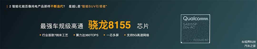 在智能化方面,搭载了最新的GKUI吉客智能生态车载系统的星越L将配备全液晶仪表、AR-HUD抬头显示以及长度100cm的宽体连屏,引入时下最前卫的智能科技应用。另外,在智能化驾驶方面,吉利星越L也是首款搭载5G-AVP技术的燃油量产车型,融合了时下最尖端的毫米波雷达以及车规级高通第三代晓龙8155芯片,能够实现“最终1km完全无人自主泊车”,具备了L4级别自动驾驶技术。
