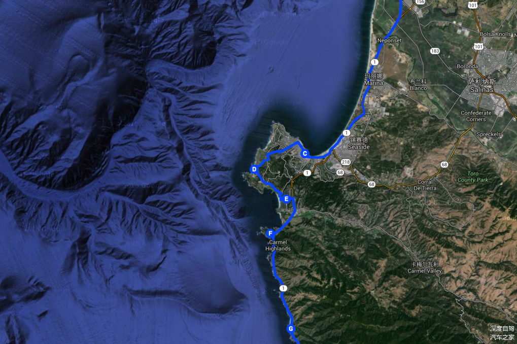 大瑟尔(Big sur)全长有90英里左右,公路依着山坡高低起伏、曲折盘旋、一路向前。坐拥两百多出大小弯道,平均宽度6米,最窄处仅为4.1米,起伏高度落差大于60米,常年风速在30公里/小时以上