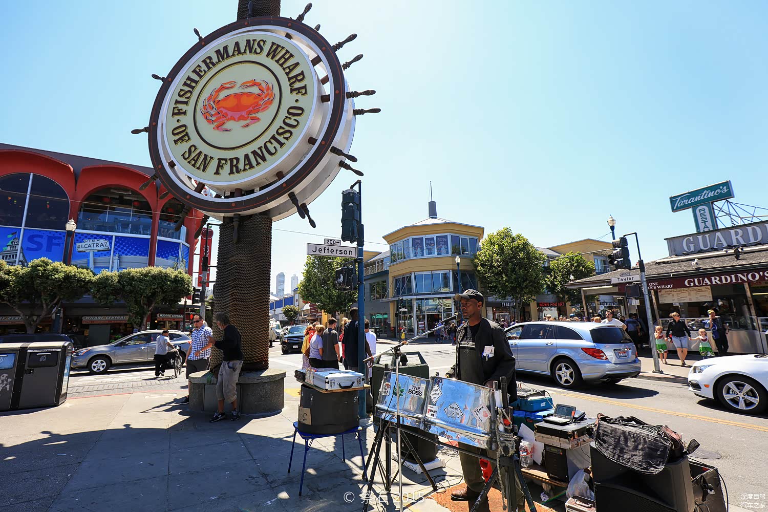 旧金山主要旅游地区-渔人码头,一个画有大螃蟹的圆形广告牌映入眼帘,这里汇集了大量的商店、饭店。