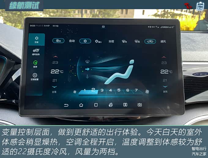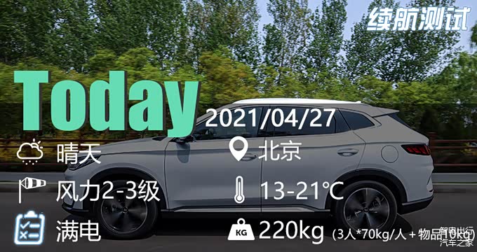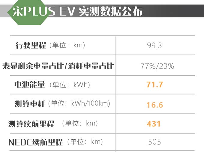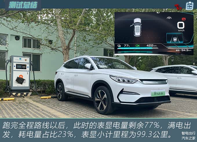 宋PLUS EV的表显小计里程为99.3km,表显剩余电量占比为77%,所以消耗电量占比为23%,结合71.7kWh的电池组容量,可以测算其实际消耗电量约为16.6kWh/100km(电池组容量×消耗电量占比÷小计里程公里数)。最后再结合其71.1kWh的电池组容量,可以推算宋PLUS EV在这种综合路况下的实际续航为431km,对比505km的NEDC续航,比例占到了85.3%,表现优秀。(由于此次活动时间较为紧张,没有采用严谨的消耗电量取实际补充电量数值,以上测试推算结果供大家参考,今后会为大家带来更全面的续航测试。)