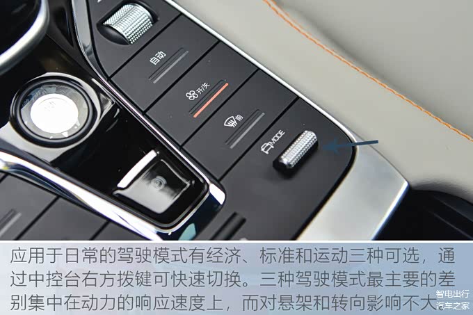 Eco(节能)、Normal(标准)、Sport(运动)三种驾驶模式没有太强的性格区分,主要集中在动力的响应速度上。Eco模式下,加速踏板的初段反应速度会进一步降低,稍显迟缓;而运动模式下,加速能力会有一定提升,但随之而来的是更机敏的踏板反应,更适用于有快速超车需求的时候。综合来说,标准模式在动力响应以及提速表现上都是最适用于日常的。
