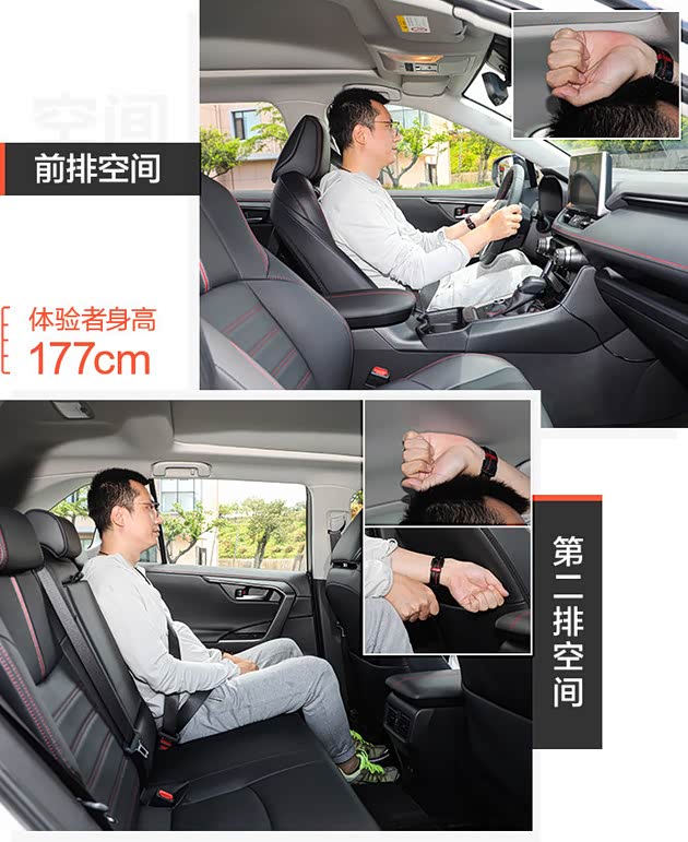 其他方面,与普通混动版本没有区别,空间表现方面,威兰达高性能版没有因为电池的加入缩小车内的空间,体验者身高177cm,空间如上。