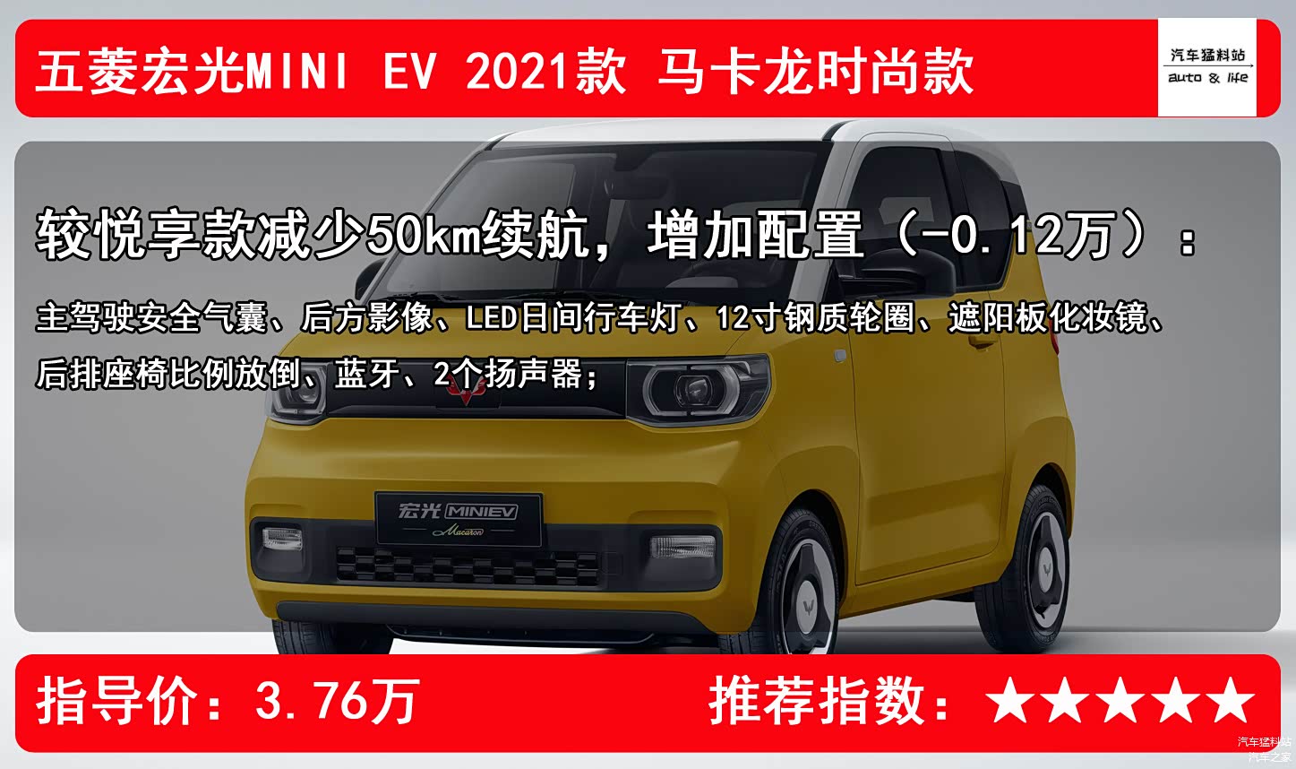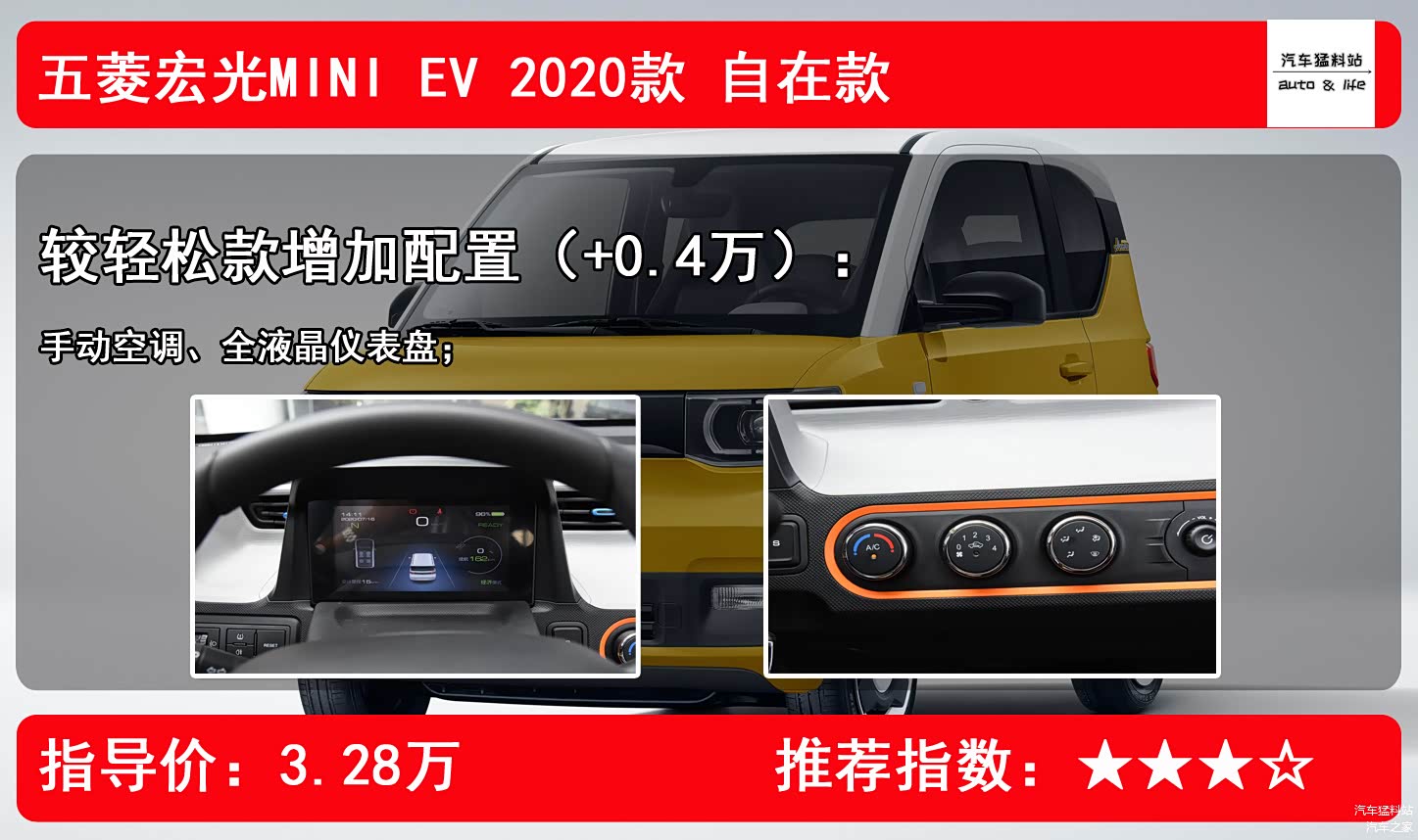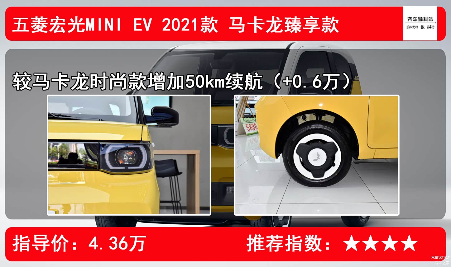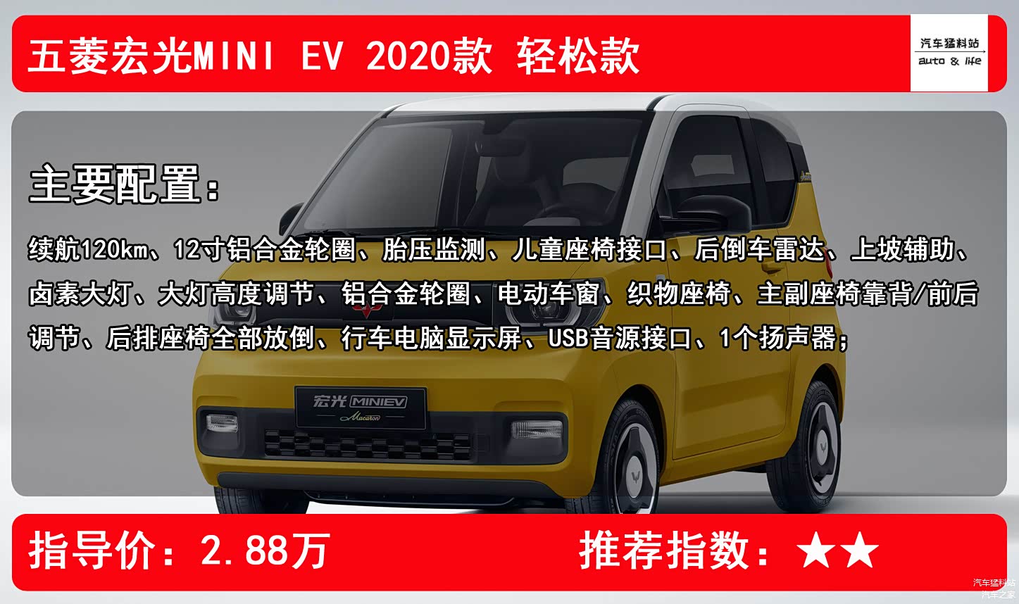 五菱 宏光MINI EV(图片 | 参数 | 询价)在近半年来的表现可谓是大火特火,其除了实现销量上超越特斯拉Model 3,3月份的销量甚至还超过了哈弗H6,坐上国产车销量的第一把交椅。而究其原因,轻便好开的特性是其关键因素,而最重要的是还是其2.88-4.36万的超低售价。当然,哪怕是顶配4.36万的价格,对于许多车友来说也压力不大,但再便宜也要性价比,如果考虑入手宏光MINI EV的话,选哪款更划算呢?