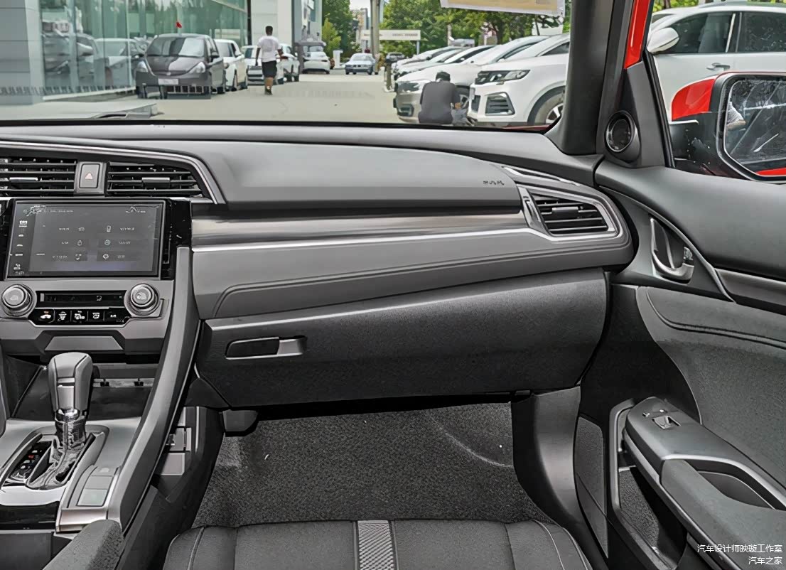 相比之下,第10代思域的内饰,前部车门板设计材料很普通,没有金属丝纹理材料,仪表盘上方的材料是硬塑料,没有11代新款的材料柔软,空调出风口的设计也很常规,下面挡位部分的材料也不同。