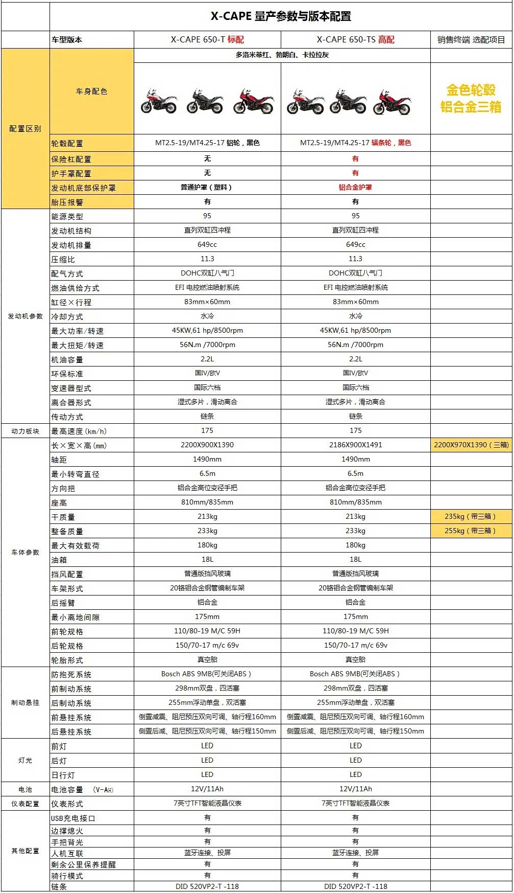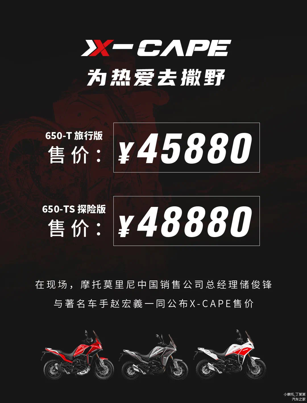 说完这些,我们聊聊这次的新车:X-Cape,本来笔者和其他媒体老师沟通的时候,盲猜是56000,毕竟有Brembo、TFT仪表、滑动离合以及马祖奇减震加身,但是没想到最后给了一个非常非常惊喜的售价:旅行版¥4.58万元,探险版¥4.88万元,刚好比我的预测少了1W元,可以说是一个非常诱人的售价了。