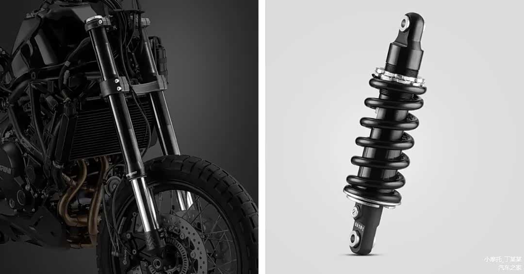 MARZOCCHI和摩托莫里尼联合开发的预载多段、双向阻尼可调前减震,轴行程160mm;后减震为KYB的预载多段、双向阻尼可调减震,轴行程103mm,前后减震精心调校让你面对不同路况从容不迫。