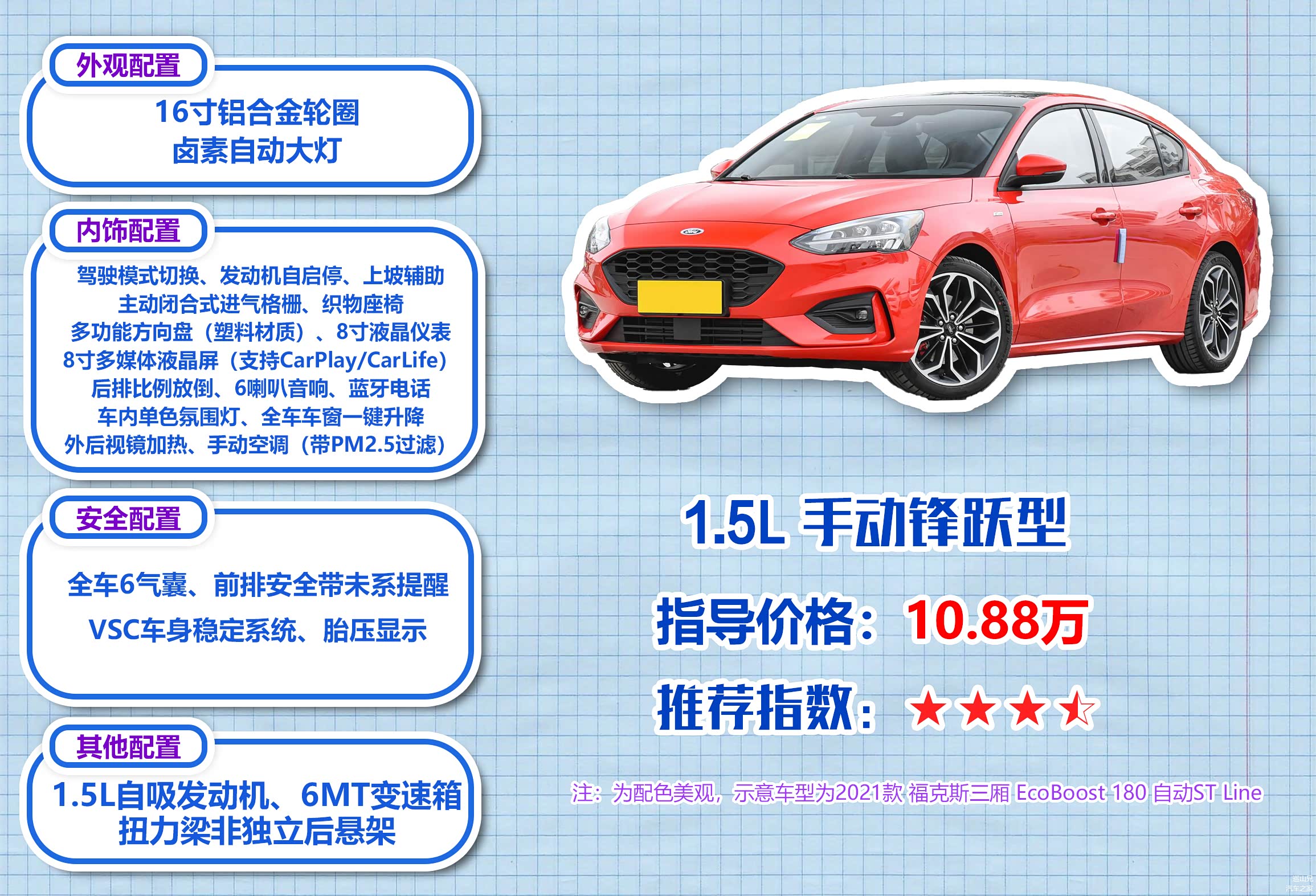 作为三厢版唯一的手动挡车型,1.5L 手动锋跃型的基础配置其实并不低,16寸铝合金轮圈、卤素自动大灯、驾驶模式切换、发动机自启停、上坡辅助、主动闭合式进气格栅、多功能方向盘(塑料材质)、8寸液晶仪表、8寸多媒体液晶屏(支持CarPlay/CarLife)、织物座椅、后排比例放倒、6喇叭音响、蓝牙电话、车内单色氛围灯、全车车窗一键升降、外后视镜加热、手动空调(带PM2.5过滤)都有装备,安全性配置方面全车6气囊、前排安全带未系提醒、VSC车身稳定系统、胎压显示也算是同级主流的表现。我觉得配置上比较可惜的就是后扭力梁悬架和没有后排空调出风口,如果您预算有限,这款入门车型还是可以考虑的。