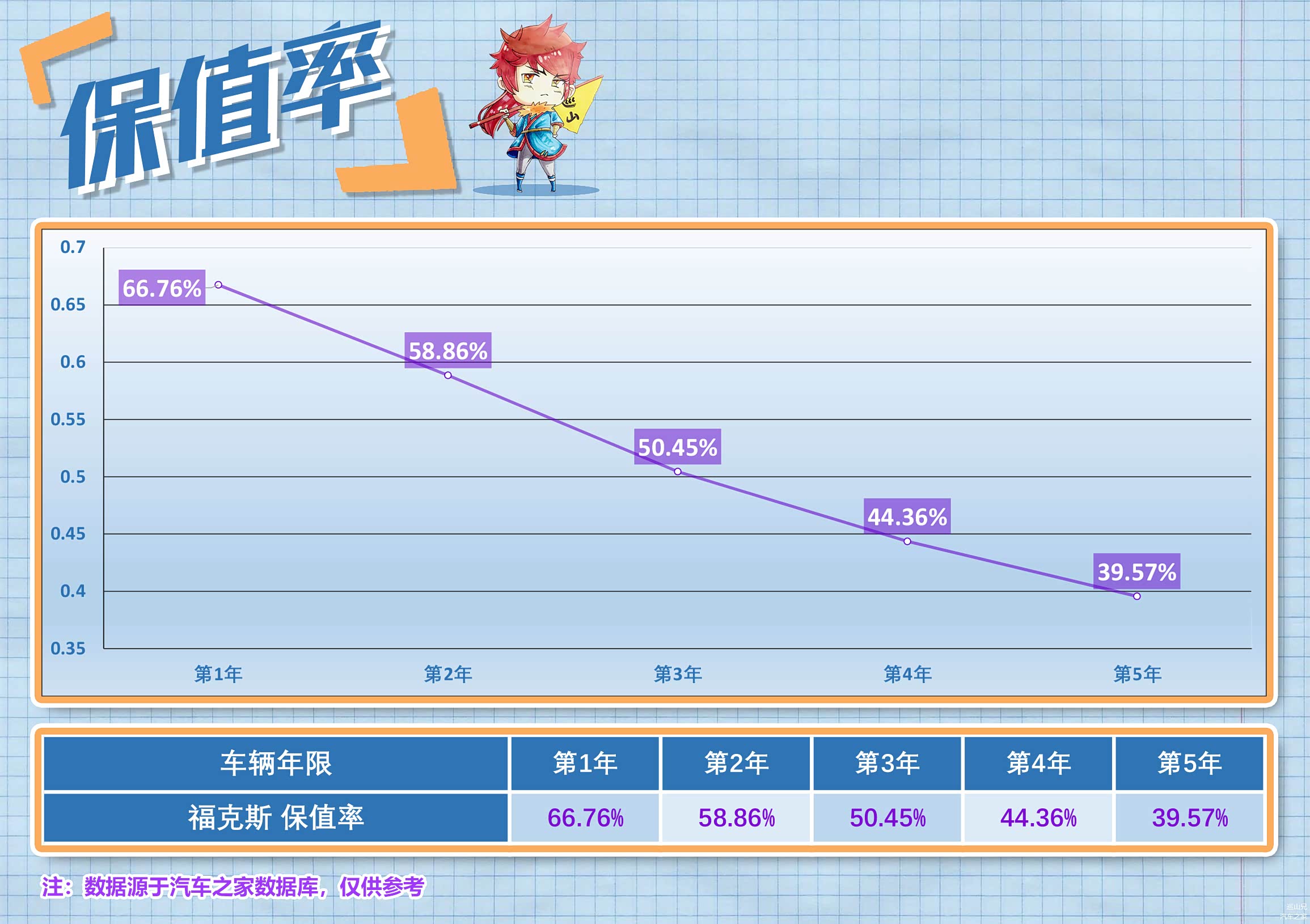保值率方面,作为合资车型,福克斯的表现只能说一般。第五年只有39.57%的残值,比起大众高尔夫的47.54%,相差约为8%,如果您比较在意保值率,那最好还是选择丰田或本田这样保值率比较高的品牌。