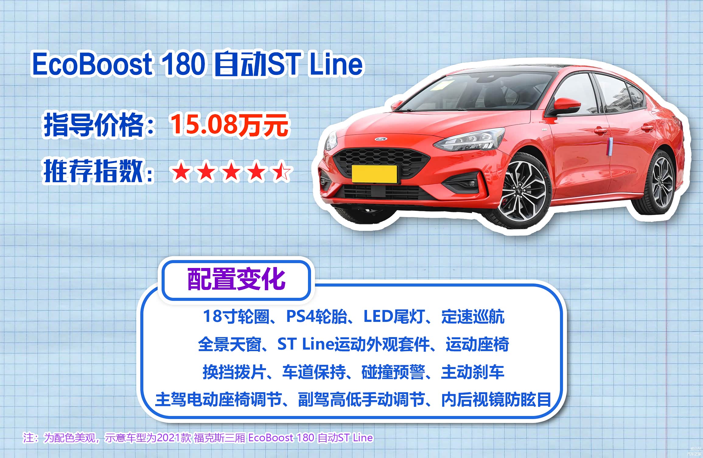 作为三厢版最贵的车型,EcoBoost 180 自动ST Line版在外观上的升级比较明显,运动风格轮圈、米其林PS4轮胎、运动包围、红色刹车卡钳让整车看起来有些性能车的影子,再加上运动座椅和换挡拨片,相信年轻人看了都会喜欢。除此之外,舒适性配置也得到了升级,加入了全景天窗、后视镜自动防眩目、副驾驶座椅6向调节、主驾座椅电动调节、定速巡航、车道保持、碰撞预警、主动刹车。这样的配置表现完全对得起1.4万元的差价,如果您预算相对宽裕的话,那EcoBoost 180 自动ST Line版也是一款不错的选择。