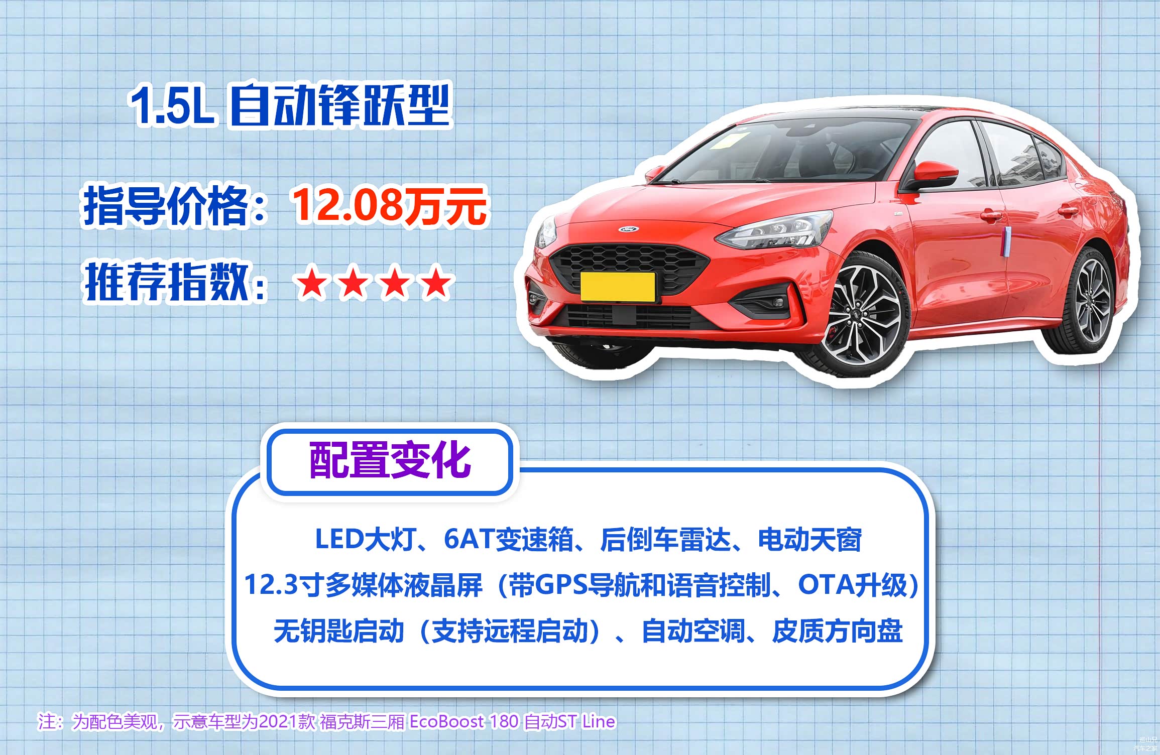 相比最低配1.5L 手动锋跃型,自动锋跃型顾名思义将变速箱换成了6AT,并且还增加了LED大灯、后倒车雷达、电动天窗、12.3寸多媒体液晶屏(带GPS导航和语音控制、OTA升级)、无钥匙启动(支持远程启动)、自动空调和皮质方向盘。如果您开不惯手动挡,那1.5L 自动锋跃型完全可以满足您的日常用车需求。
