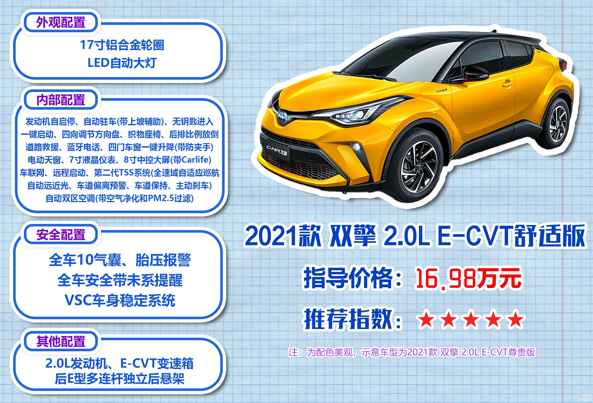 车型方面,巡山兄觉得指导价16.98万的双擎舒适版就不错。虽然是最低配车型,但标配了全车10气囊、发动机自启停、自动驻车(带上坡辅助)、无钥匙进入、一键启动、四向调节方向盘、织物座椅、后排比例放倒、道路救援、蓝牙电话、四门车窗一键升降(带防夹手)、电动天窗、7寸液晶仪表、8寸中控大屏(带Carlife)、车联网、远程启动、第二代TSS系统(全速域自适应巡航、自动远近光、车道偏离预警、车道保持、主动刹车)和自动双区空调(带空气净化和PM2.5过滤),可以说除了后排空调出风口、后排USB电源和倒车影像这三个配置外基本都配齐了,整体性价比很高,是全系最值得推荐的车型。