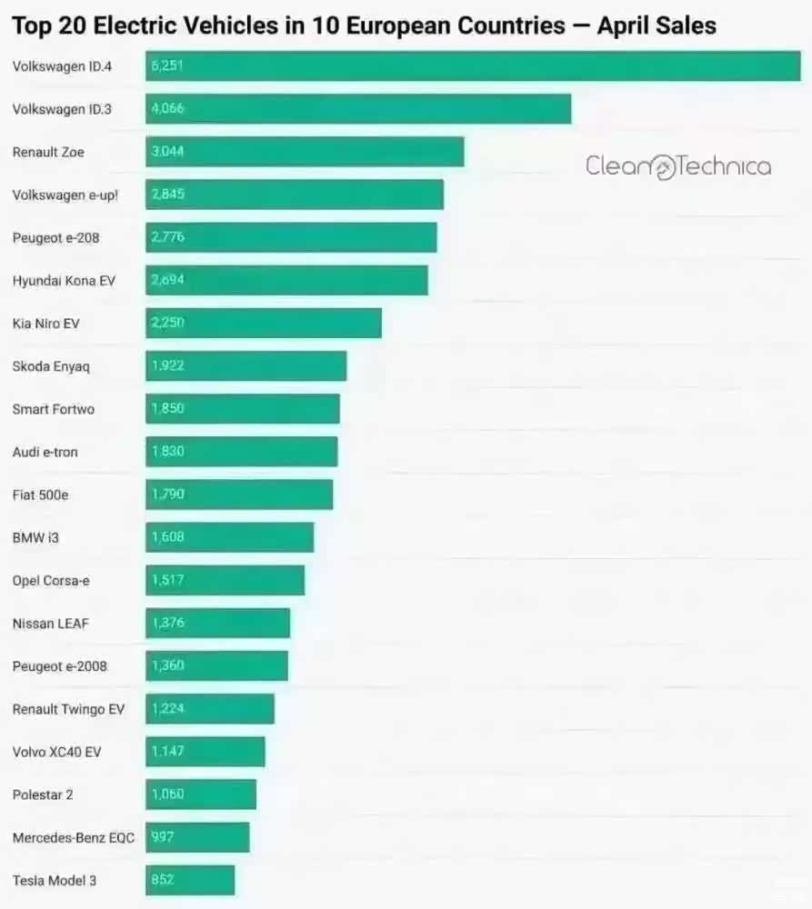 这一点,从今年4月份,大众ID.4、ID.3家族在欧洲10国位列电动车单一车型排名第一、第二的出色表现,以及特斯拉Model 3以月销852台的销量排名下滑至第20名,也从一个侧面说明在成熟市场,智能电动汽车消费格局的快速变化。