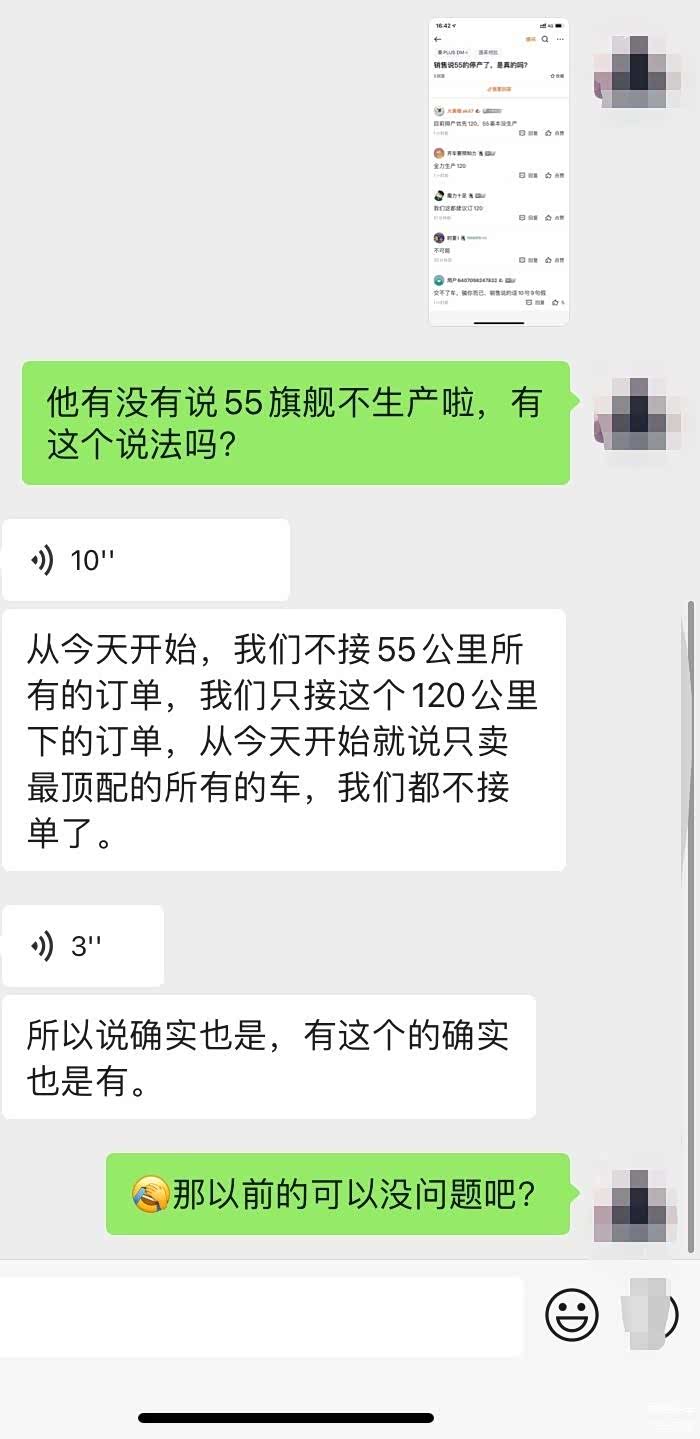 但是大部分网友还是继续接受现实改订顶配版本,“以为是新订车客户(比如本月下单51版本)暂时不排产。今天下午,实锤!实锤!实锤!我是4月头订单,接到通知不生产51版本。坐标东莞。能咋说?付了定金,等了2月整,现在这样?投诉吗?打官司吗?哎……还是老实改110版本,继续等吧。”