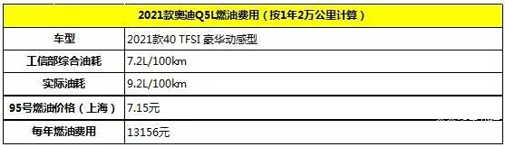 在油耗上,2021款40 TFSI 豪华动感型车型的工信部综合油耗为7.2L/100km;我们结合2021款奥迪Q5L网友车主们提供的实际油耗9.2L/100km作为参考,加注的是95号汽油,当前95号汽油油价(参考上海地区)为7.15元,按照每年2万公里计算,每年的燃油费用约为13156元。