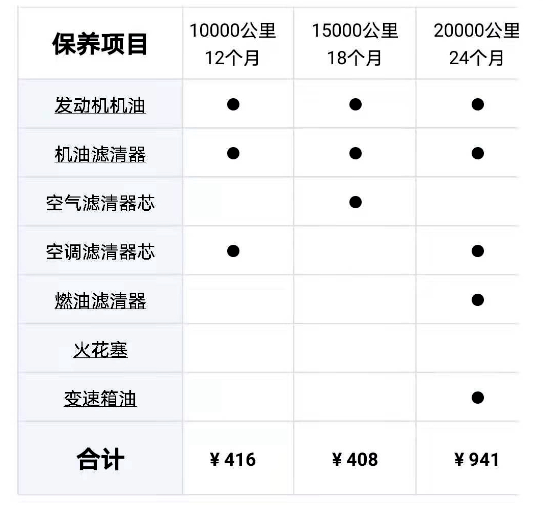 这款车保养比较便宜,小保养费用大约是416元/408元,大保养费用大约是941元。大保养两年或2万公里做一次,更换配件项目比小保养多一些,算下来大保养的费用并不高。