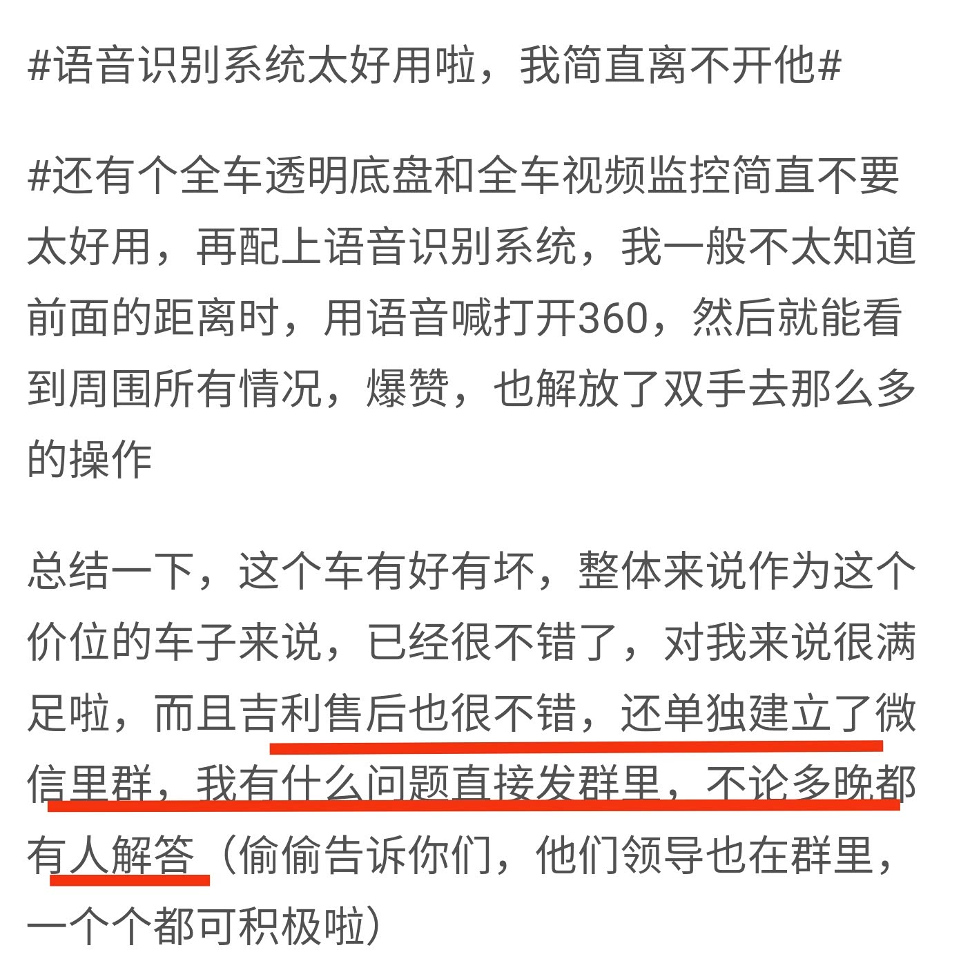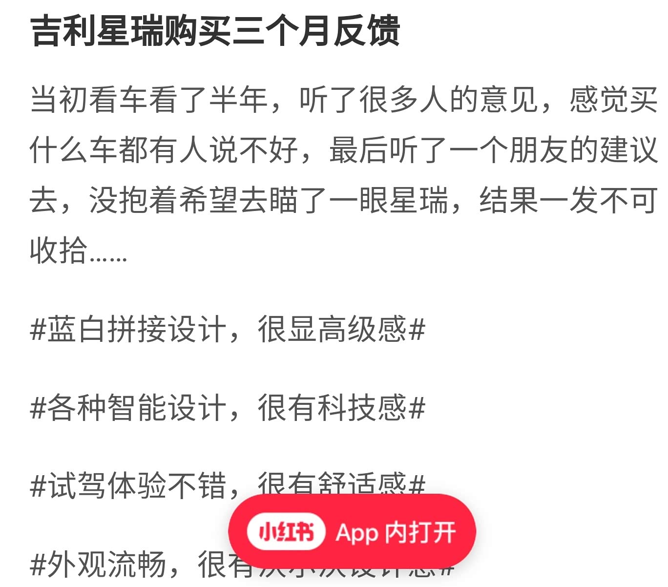 蔡蔡从不发朋友圈,平时喜欢在小红书上浏览美妆博主的分享,很少发言。但是提星瑞三个月后,她在小红书上发布了一则消息,讲述了用车体验,并且透露西物的服务也不错:“每个星瑞车主都有一个微信群,领导也在群里。”引得一众网友围观。