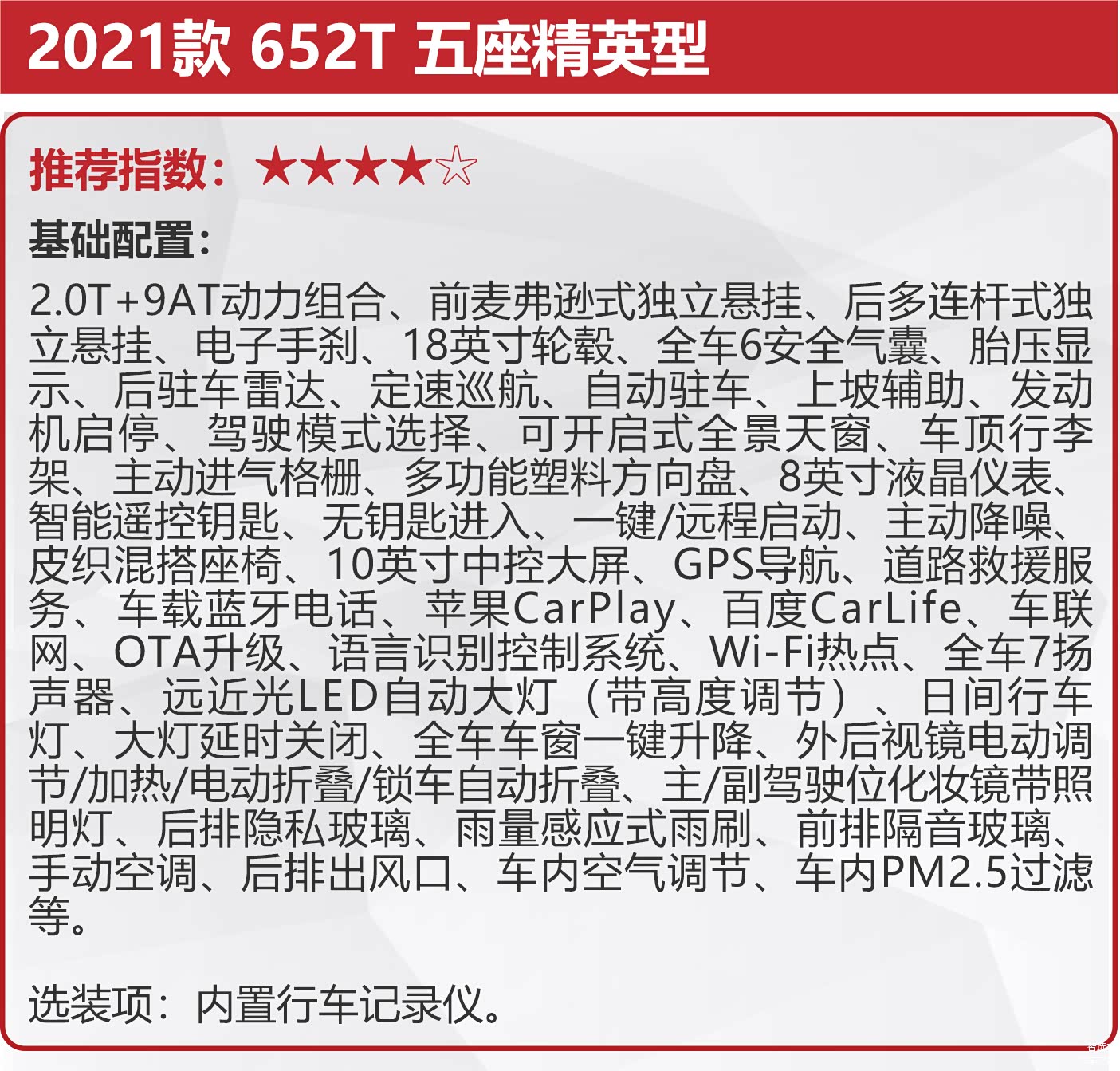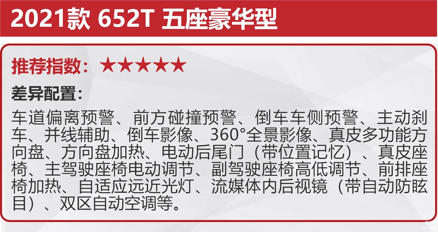 2021款 652T 五座精英型往上为2021款 652T 五座豪华型,售价为25.29万元,它在舒适性及辅助驾驶方面较入门车型均有着较大幅度的提升。舒适性方面,五座豪华型多出了真皮多功能方向盘、方向盘加热、电动尾门、真皮座椅、前排座椅加热;辅助驾驶方面,新增了车道偏离预警、前方碰撞预警、倒车车侧预警、主动刹车、360度全景影像、流媒体后视镜等配置,价格仅比五座精英型贵出2.3万元,比五座精英型更值得推荐。
