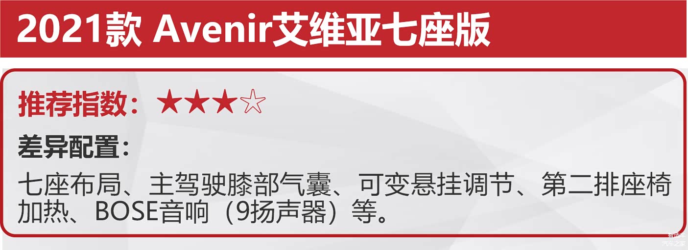 2021款 Avenir艾维亚七座版为全系的顶配车型,它的配置在Avenir艾维亚五座版车型的基础之上再进行了升级,新增了主驾驶膝部气囊、可变悬挂、第二排座椅加热、BOSE音响等配置。但它的售价也高达30.99万元,并不值得推荐。