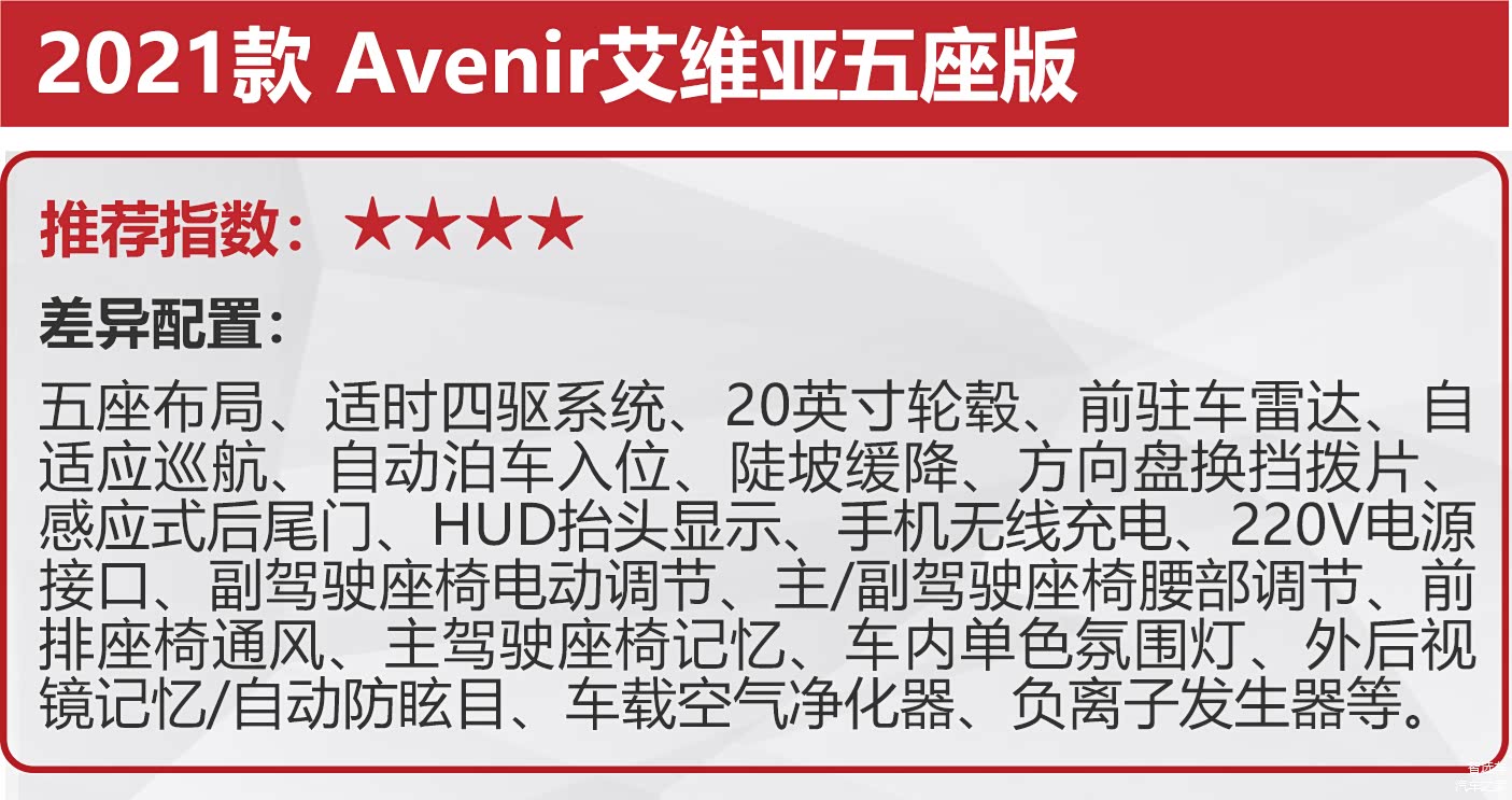 2021款 Avenir艾维亚五座版为五座顶配车型,它的配置还是比较丰富的,HUD抬头显示、自动泊车、自适应巡航、无线充电、氛围灯等均有配备,但结合其近30万元的售价,并不是十分值得推荐。