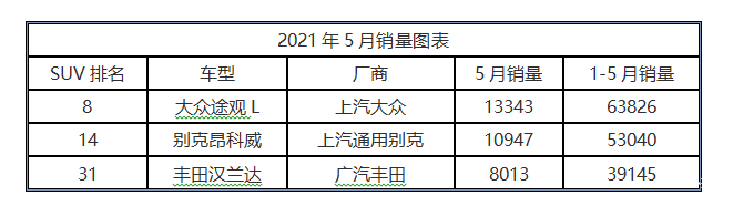 从目前的市场销量来看,2021年5月数据显示,汉兰达的销量最低,途观L的销量最高。