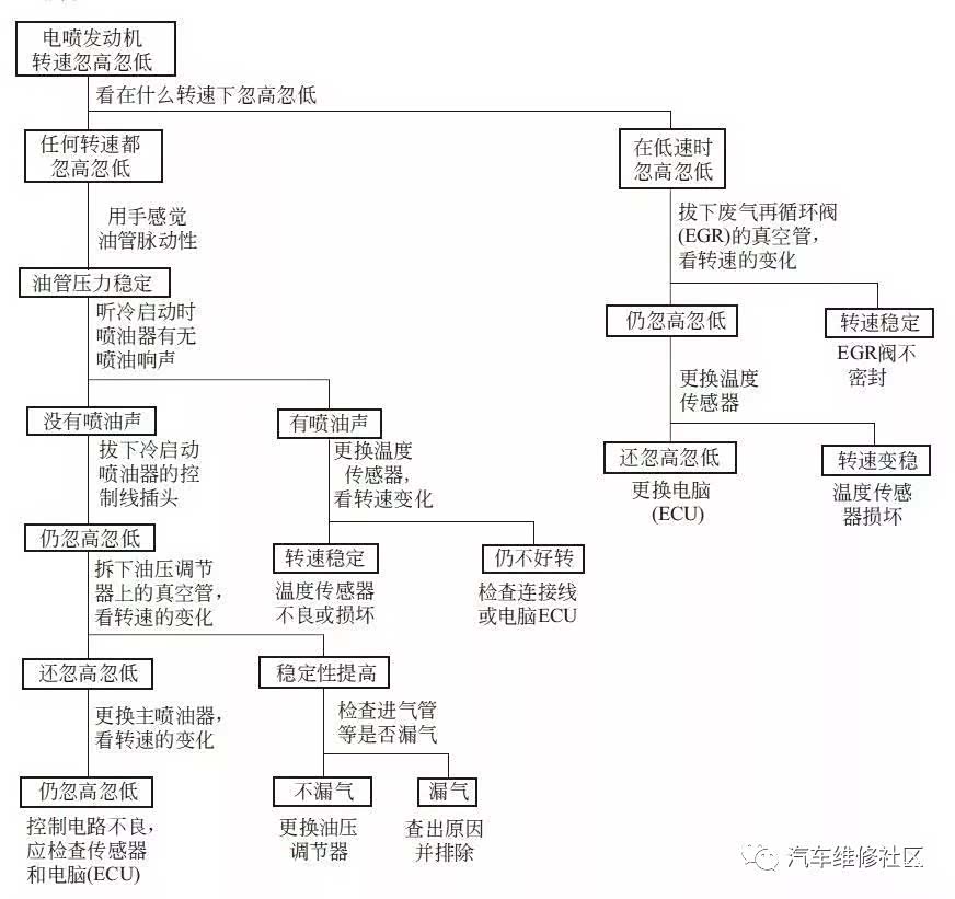 可能的故障原因:① 燃油泵工作不良,使油路油压过低。② 真空管泄漏。③ 汽油中有杂质,使主喷油器的喷油量不稳定。④ 温度传感器、温控开关、电脑(ECU)等工作失常,使冷启动喷油器误动作。⑤ 废气再循环(EGR)阀工作不正常,或控制失常。电喷发动机转速忽高忽低的检查流程 ▼