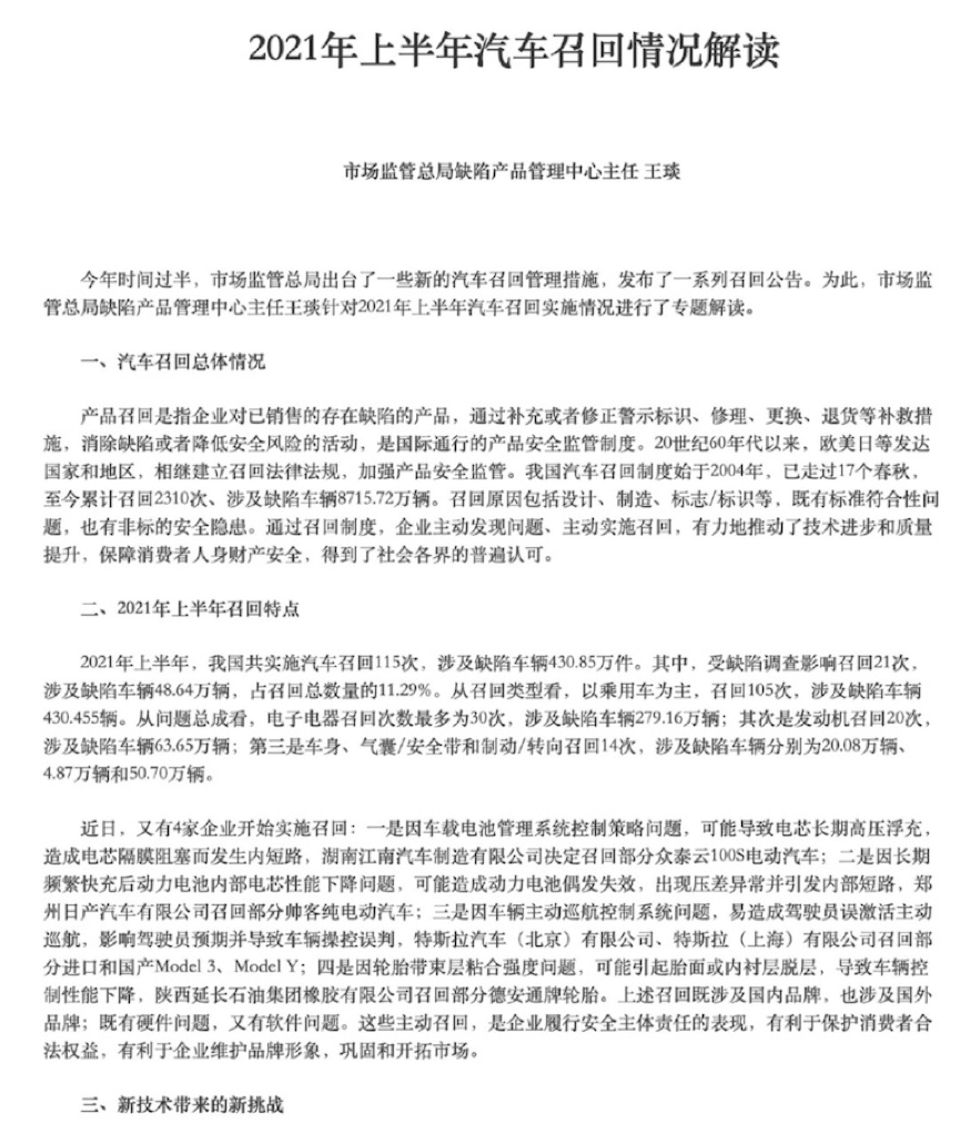 在做了一系列自问自答之后,公告最后,特斯拉贴出了一份由市场监管总局缺陷产品管理中心主任王琰所做的《2021年上半年汽车召回情况解读》专题解读文章,文章中分析了今年上半年的汽车召回情况,其中有不少与特斯拉此次召回相关的内容。