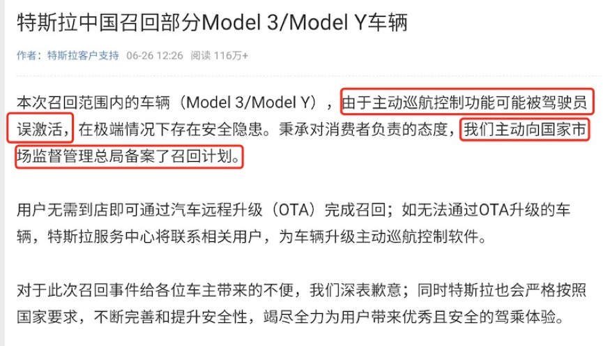比如,国家市场监督管理局公告中很明确的表示,此次召回活动是在国家市场监督管理局启动缺陷调查情况下开展的,换句话说,这不是特斯拉主动的召回,而是在被国家市场监督管理局发现了问题之后的“被迫”召回。