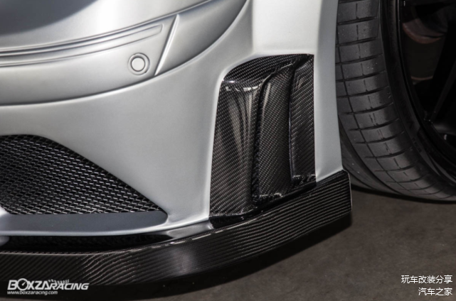 图:前杠也一样,属于整体碳纤维,侧出风口非常经典,可以为散热器通风。