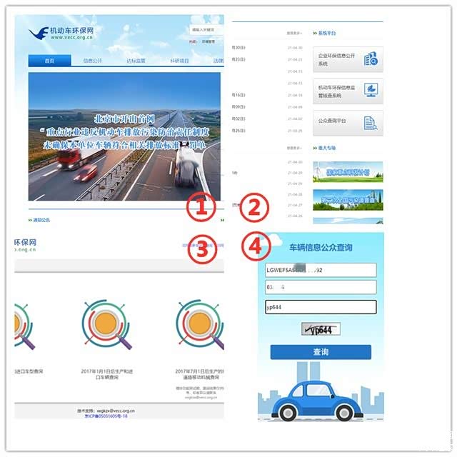 如果车子已经到手了或者找不到纸质清单,也可以通过PC端登录“机动车环保网”,按照下图的步骤,通过输出车架号和发动机编号后六位,在线查询对应车辆的环保信息。