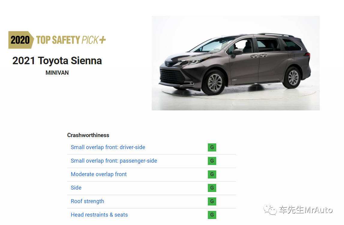 主动安全配置方面,美规第四代Sienna全系标配了丰田TSS 2.0安全套装并在第三排还标配10安全气囊,整车在安全防护方面做得非常到位。这也使得其荣获了IIHS 2020 TOP SAFETY PICK+的最高安全推荐成绩。以此为基础,广汽丰田赛那的安全性能应该会有保障。
