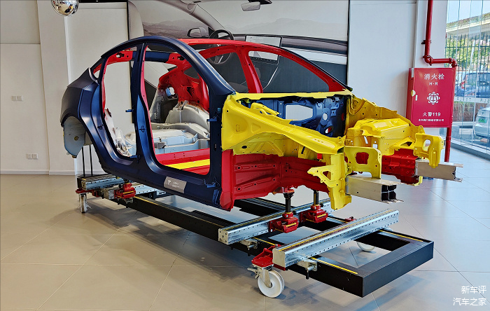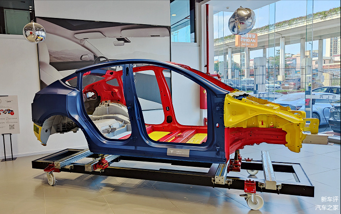 店里摆的这台Model Y的白车身,按照行业惯例,也用不同颜色的油漆标明了不同部位使用的材质。因为特斯拉总部的培训师也在,我们也拿到了Model Y白车身的材质比例:超高强度钢18.7%,高强度钢38.3%,软钢12.5%,铝30.5%。我们在这台白车身上看到涂着红色油漆的部分,就是使用超高强度钢的部位。