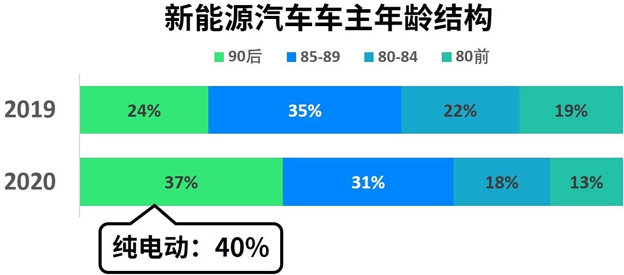 意料之中,至2020年,90后已成为了新能源车主中的“主力军”——90后人群的占比从2019年的24%上升至2020年的37%。在纯电动车主中,90后的车主比例更是高达40%。