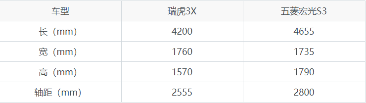 瑞虎3X和五菱宏光S3尺寸/空间对比