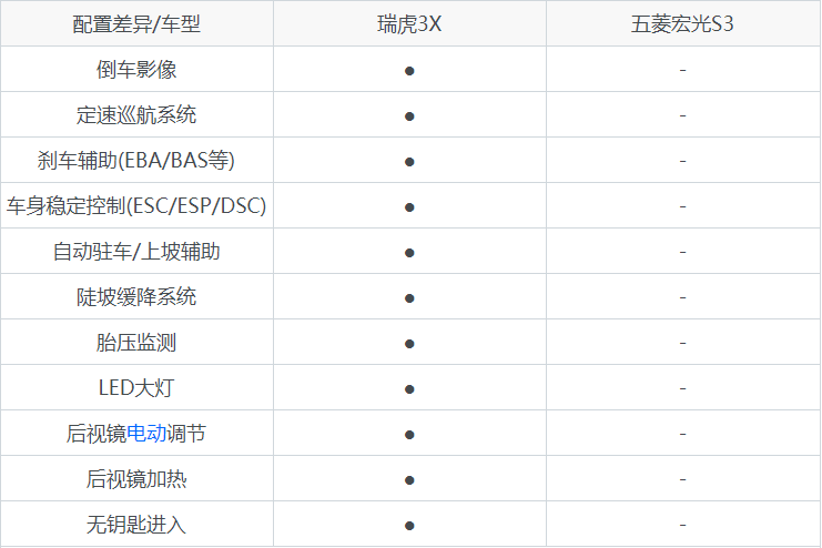后备箱/行李箱容积:瑞虎3X容积为420升;通过以上对比我们可以看到,在车身宽度上,瑞虎3X占优势;在车身长度上,五菱宏光S3占优势。