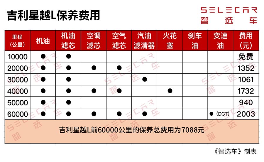 吉利星越L上市前,除了价格,大家最关心的是该车的保养费用,毕竟它搭载了沃尔沃的Drive-E系列发动机,理论上来说保养不会便宜。笔者此前咨询了吉利的4S店销售人员,得到的反馈是:“可以参考领克车型的保养费用,吉利星越L只会更低,不会更高”。经计算,吉利星越L前60000公里的保养总费用为7088元;7DCT变速箱的换油周期为60000公里,8AT变速箱的换油周期为80000公里。