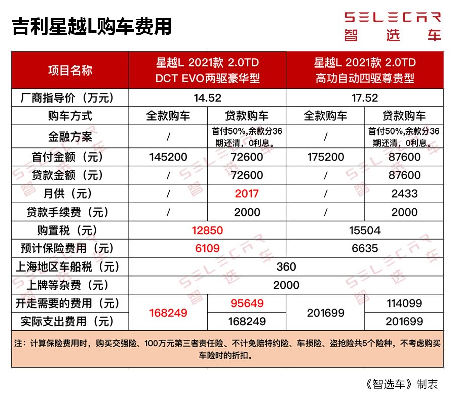 通过全文概要,我们已经了解吉利星越L购车、用车的基本信息。该车的官方指导价为13.72万-18.52万元,动力系统搭载2.0T发动机,低功率版车型匹配7DCT变速箱,采用前轮驱动;高功率版车型匹配8AT变速箱,采用四轮驱动。小智接下来将分别基于【 星越L(图片 | 参数 | 询价) 2021款 2.0TD DCT EVO两驱豪华型】和【星越L 2021款 2.0TD 高功率自动四驱尊贵型】这两款配置进行详细的购车、用车成本解读。(下文两款配置分别简称:两驱版星越L、四驱版星越L)