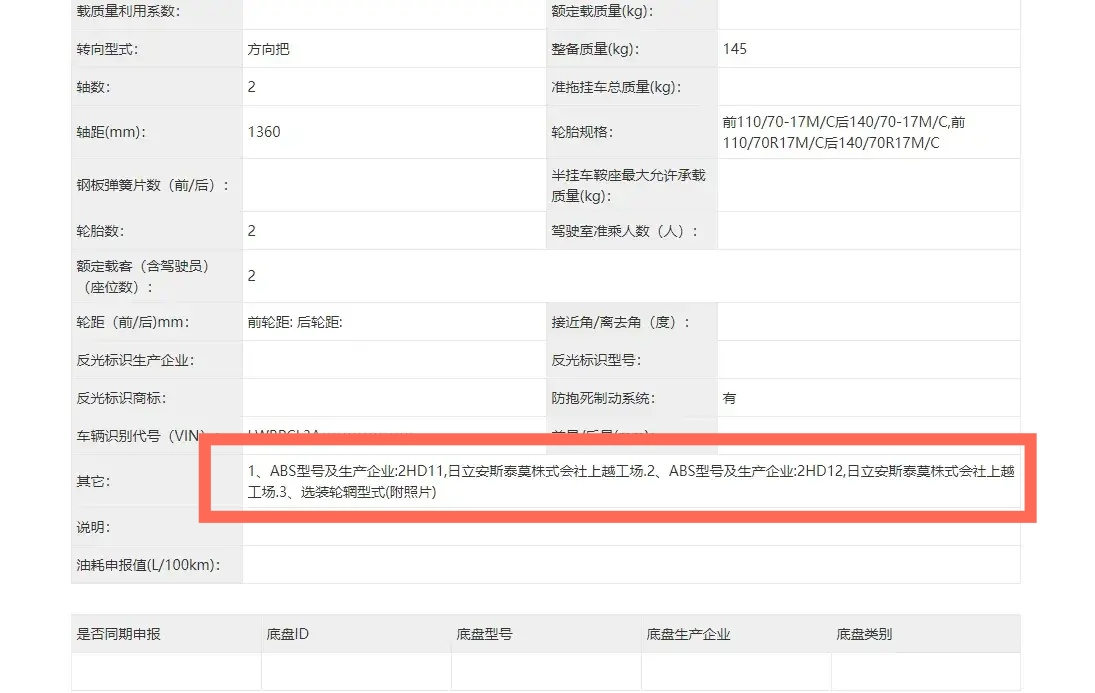 2.配置增强,新款190ss将有可能装配双通道ABS。因为在申报信息其它一栏中,ABS用序号标注了两次,这意味着190ss将会装备后轮ABS,如此一来这款车将会实现真正意义上的双通道ABS,使其刹车性能将会得到明显的提升。