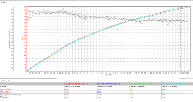 锐界的连续五次加速成绩都在11秒内,0-100km/h最快成绩达到10.12秒,如果气温降低的话,应该能再快1秒多。