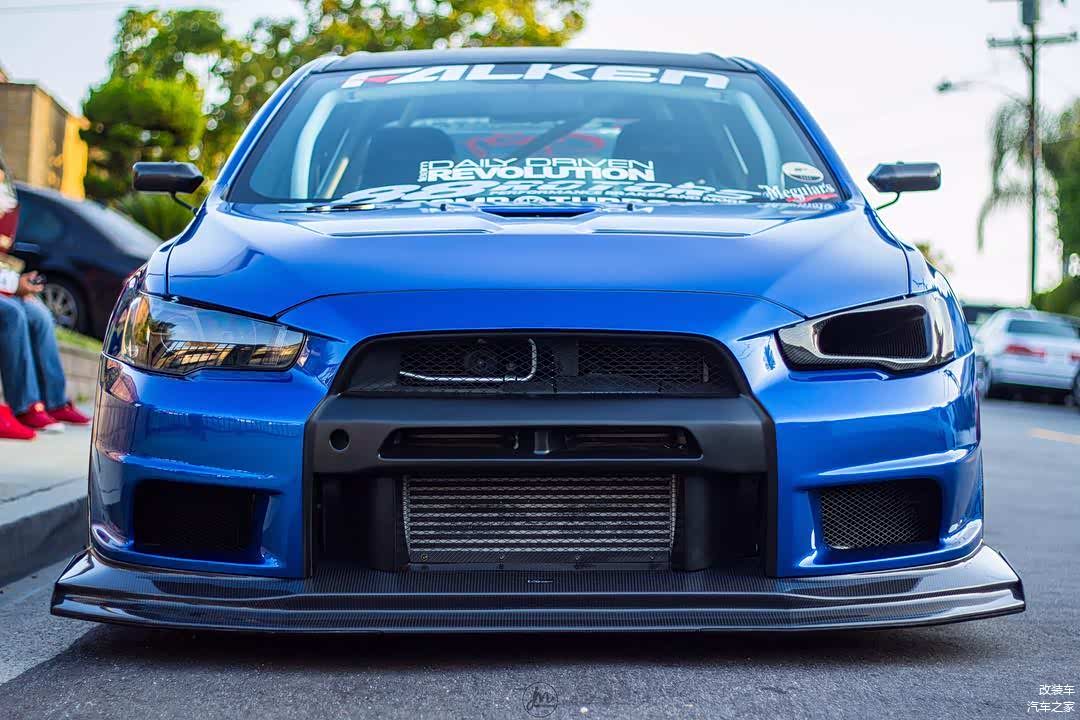 性能已经脱颖而出,外观上也不能服输,这台EVO X的前脸改装了Varis前杠和Varis的碳纤维前铲。当然,最出众的地方还是左大灯被更换成碳纤维进气口,变身为"蓝色独眼龙"。
