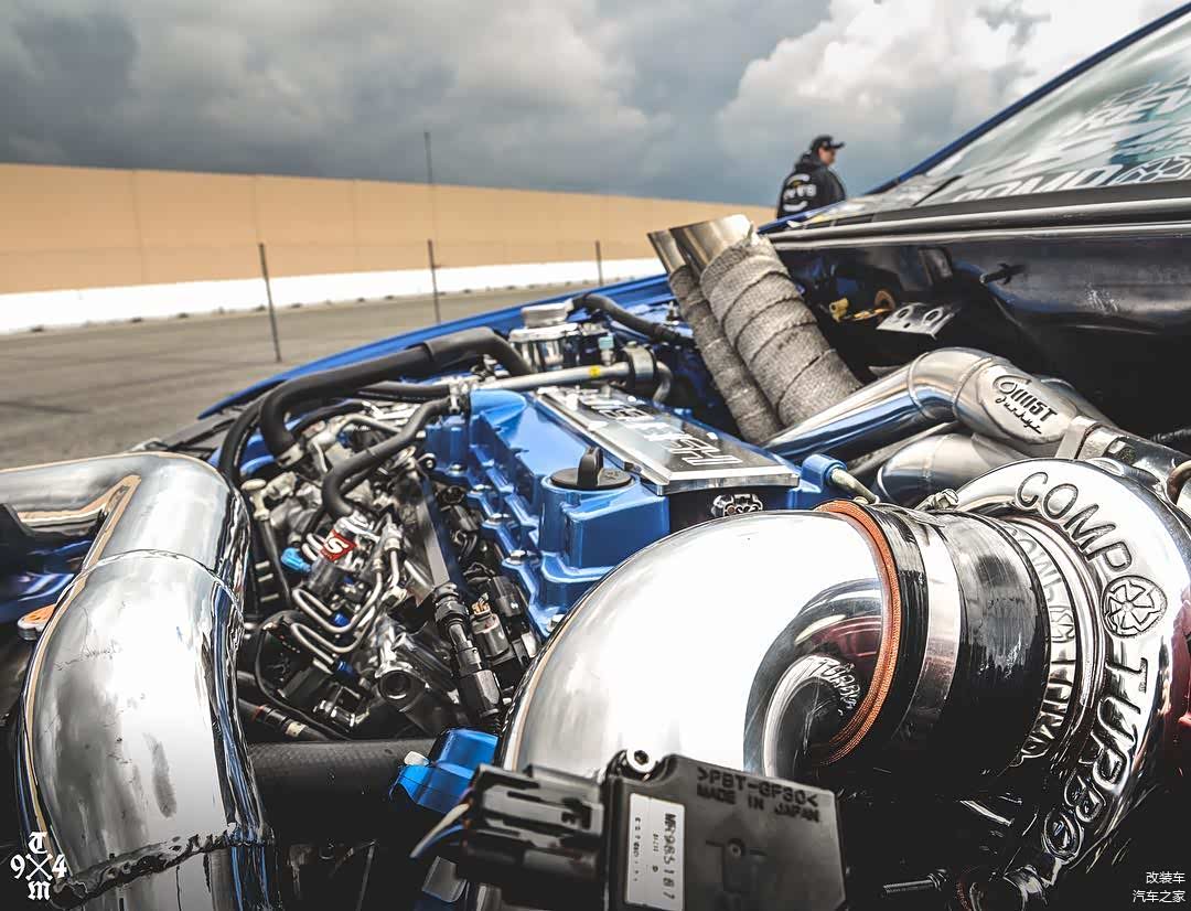 可以发现,这台EVO X的车主出门都不喜欢带上引擎盖,裸露的机舱早已不是原装模样:4B11T引擎上的装饰罩被移去,直接露出已改成蓝色的气门盖。所有管路的內外道都经过抛光处理;供油方面,改装了AEM油泵、油轨和2,200cc的Grams喷油嘴;涡轮升级为Compturbo的6262型号;AMS中冷和Mishimoto水箱保证车辆能及时得到降温冷却。