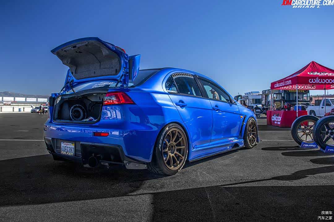 车顶包上了一层碳纤维风格的3M膜,后门车窗上的CUSCO通风口,让EVO X看起来就是一台平民赛车。